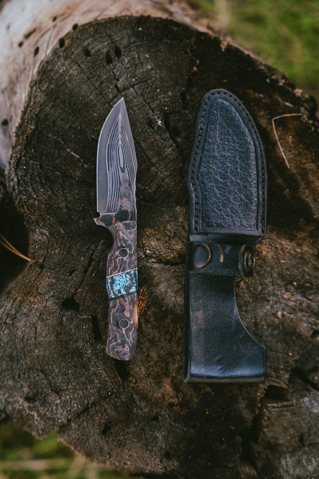 Handcrafted and assembled by bladesmith and designer Garrett Leyva in Prescott, Arizona. The doohickie is my completely focused foray into designing an edc blade. Everything about it is subtle, slim harpoon tip, almost as much blade as handle, deep finger well yet contoured handle. Custom down to the bones, cumai damascus with copper carbon fiber and turquoise carbon fiber split with copper tube and carbon fiber pins